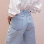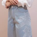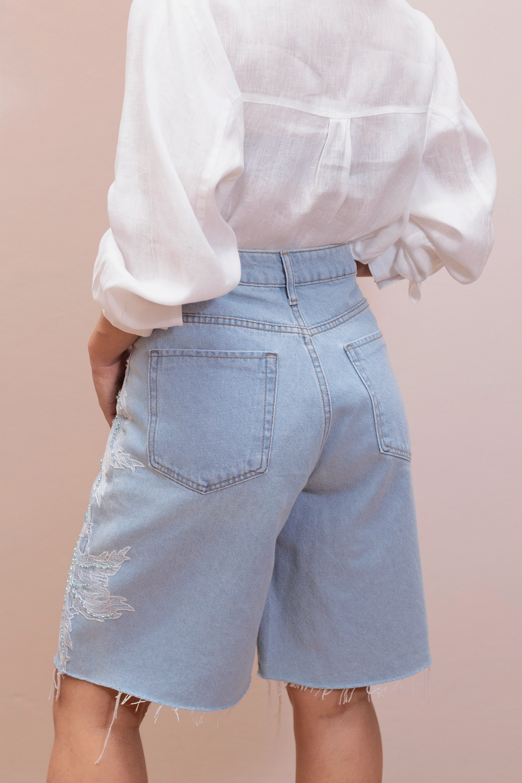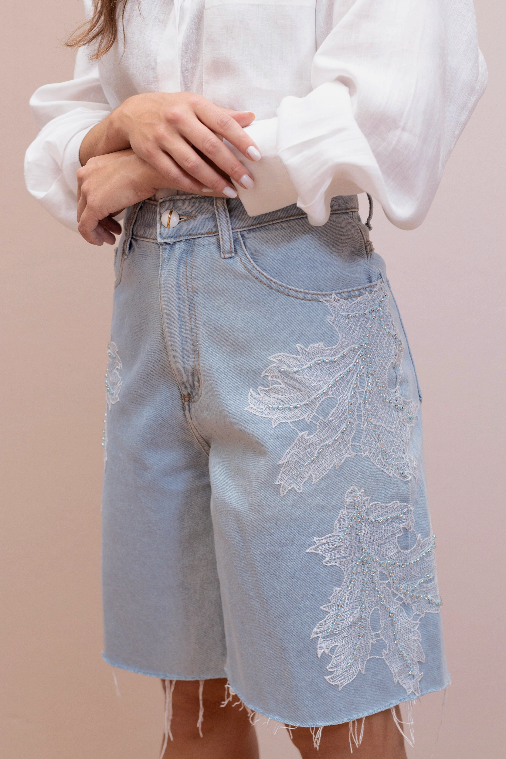 Bermuda jeans de modelagem reta e comprimento alongado com lavagem azul clara e cintura alta. A peça possui cós com passantes, fechamento frontal por botão perolado e zíper, além de bolsos posteriores funcionais em formato chapado. O destaque visual são as aplicações de renda guipure em formato de folhagens nas laterais frontais, ornamentadas com microcristais e vidrilhos que conferem brilho à textura. O acabamento da barra é em corte a fio com efeito desfiado, reforçando a estética casual da peça.