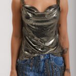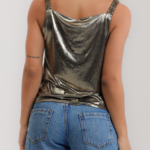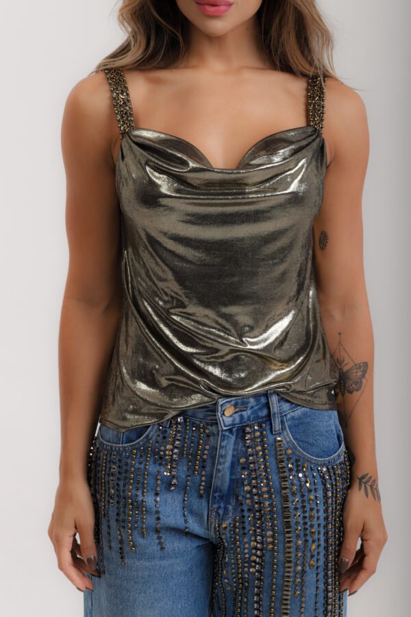 Blusa em malha laminada dourada, com moulage no decote, alças bordadas em vidrilhos, miçangas e cristais.