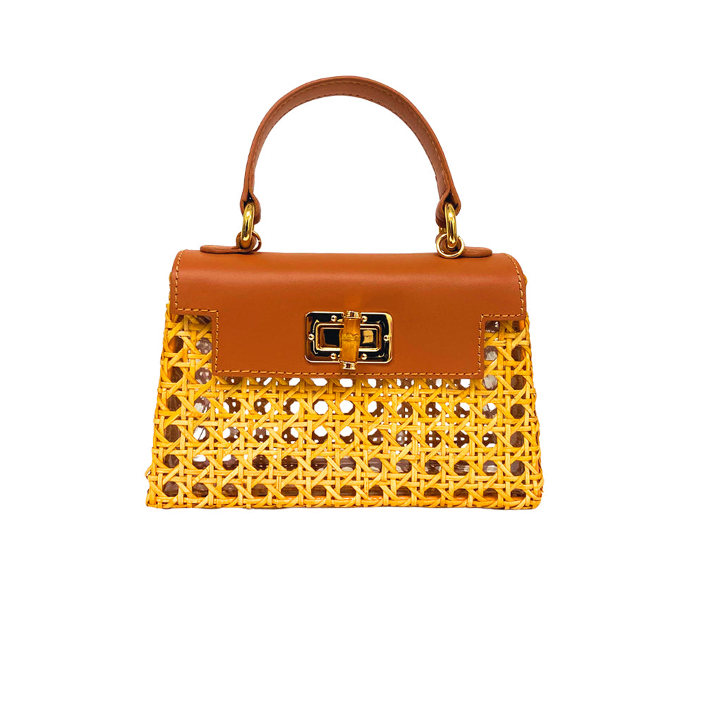 Bolsa Camille Light Honey em vime natural com trama aberta e detalhe de couro caramelo. Forro em poliéster. Fechamento magnético com detalhe em bambu. Alça de mão em couro caramelo. Acompanha alça longa de couro no mesmo tom.