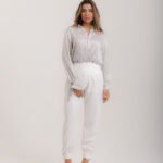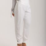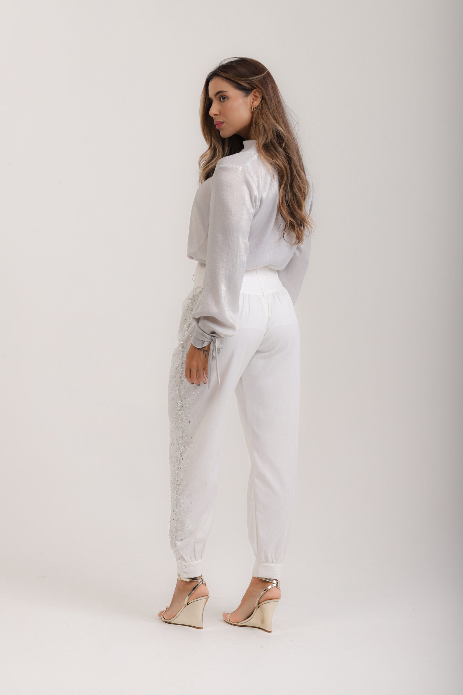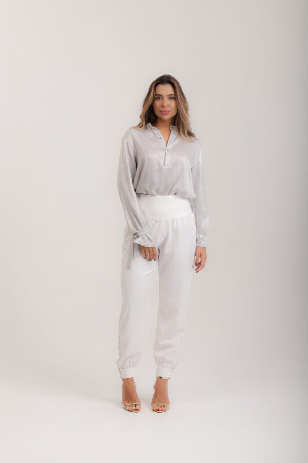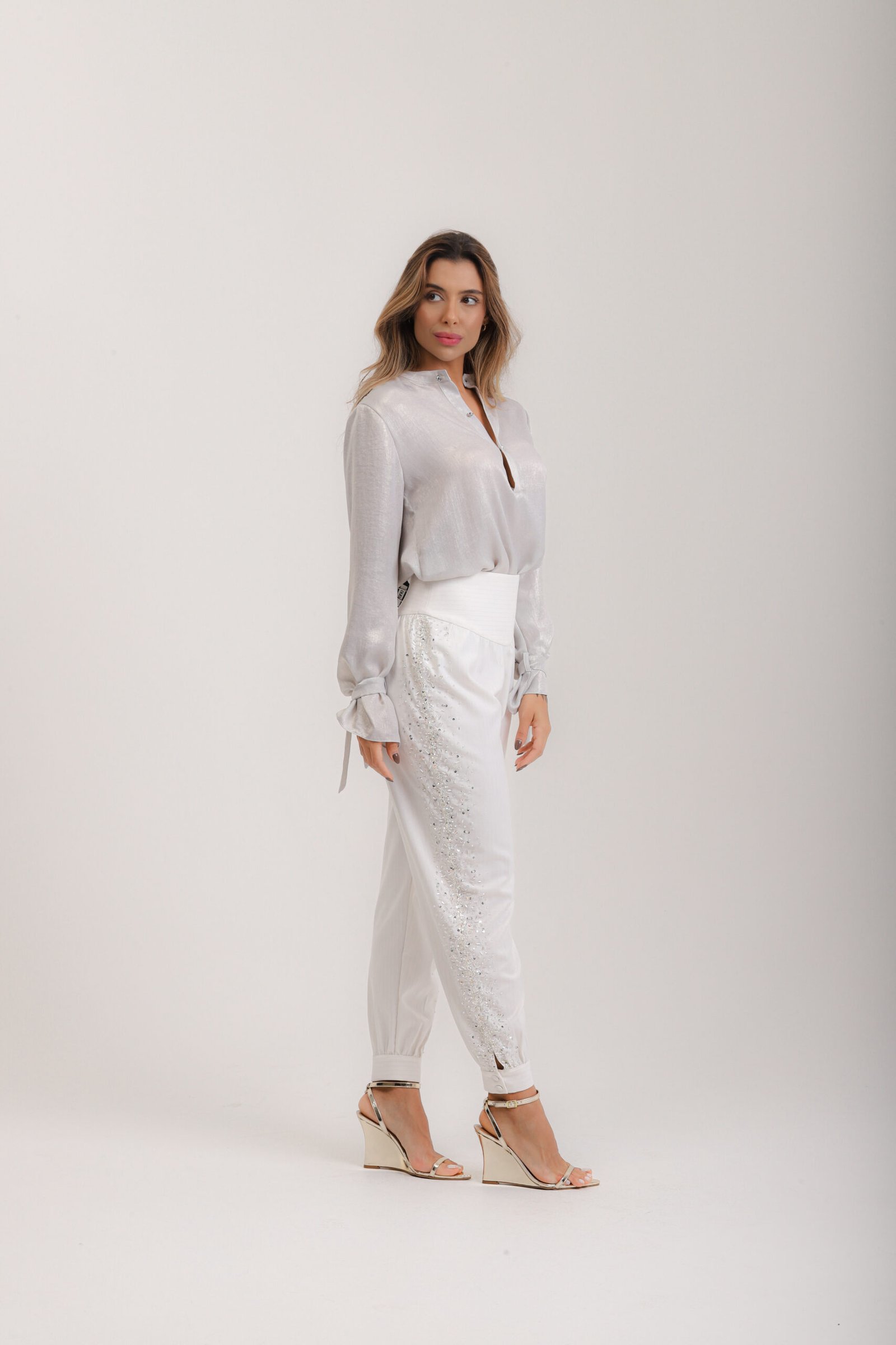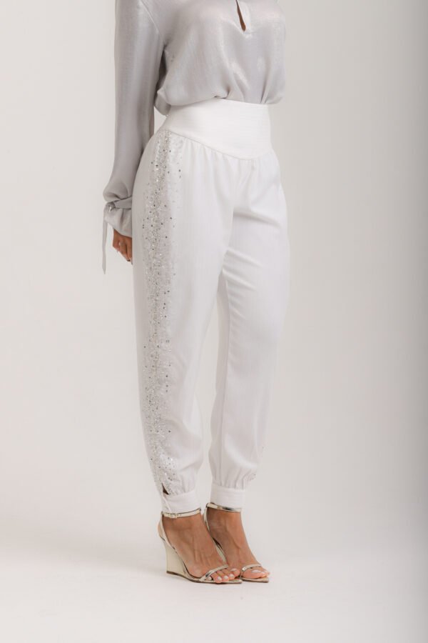 Calça aladim em berlim lurex off white risca-giz, com pala na cintura, franzido, tornozelo com fechamento em 2 botões cobertos, bordados laterais em vidrilhos e cristais, zíper invisível.