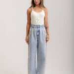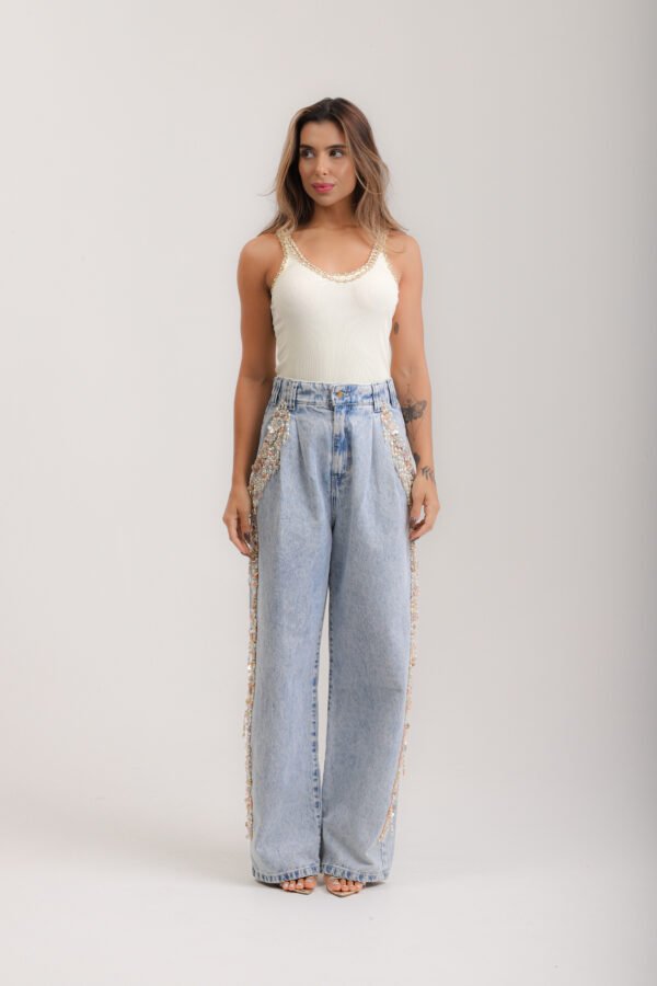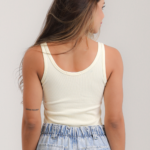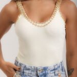 Regata canelada cavada, na cor amarelo manteiga, frente bordada* em vidrilhos, miçangas, paetês e cristais.
