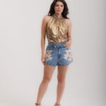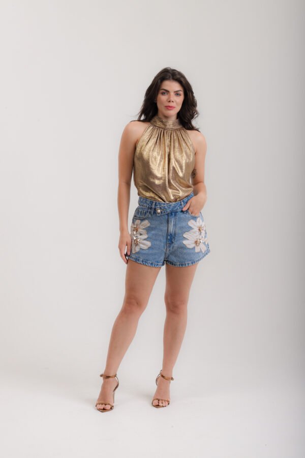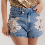 Shorts jeans com aplicação de richelieu e bordado nas laterais.