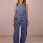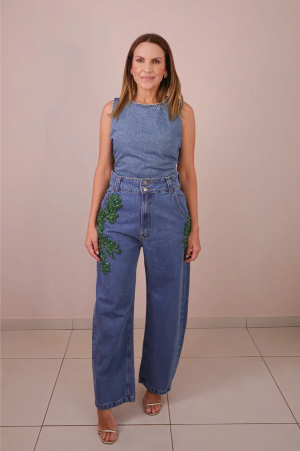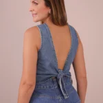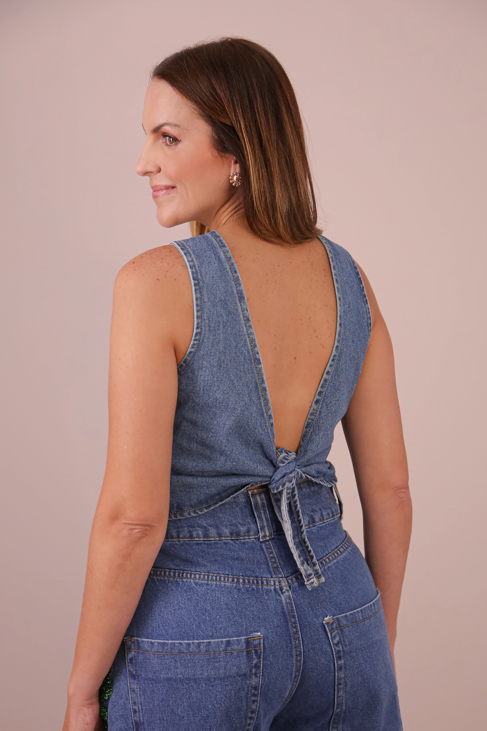 Top confeccionado em jeans de lavagem azul média. A peça possui modelagem ajustada ao corpo com decote canoa e design sem mangas (estilo regata). Apresenta recortes frontais que estruturam o busto e acabamento pespontado em tom contrastante. O diferencial da peça está nas costas, que possuem um decote profundo em “V” finalizado com fechamento por amarração em laço com o próprio tecido na altura da cintura. O acabamento das cavas e decotes é feito com costura embutida.