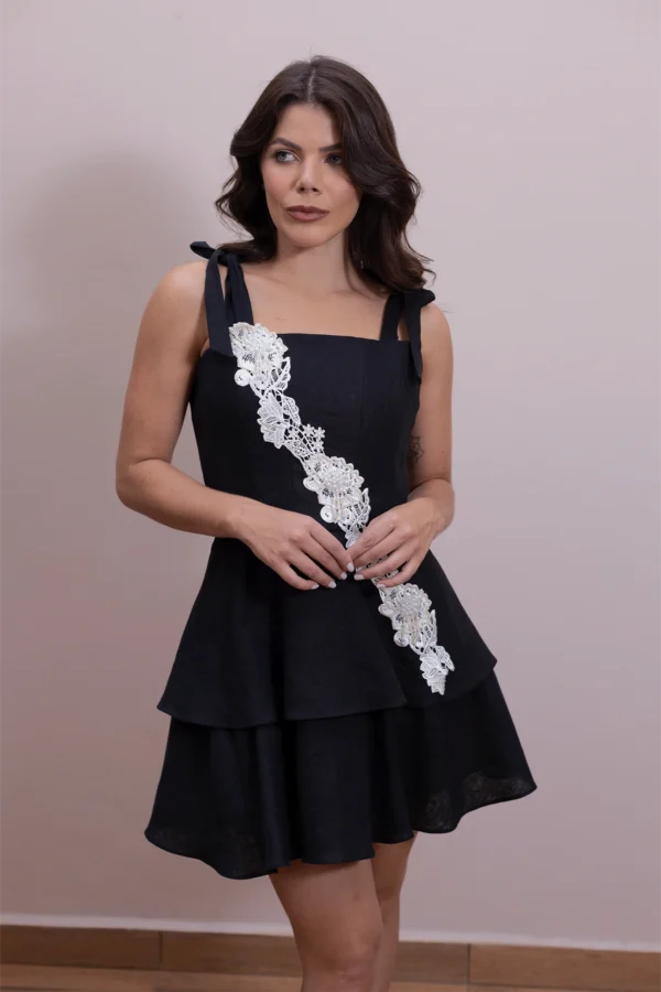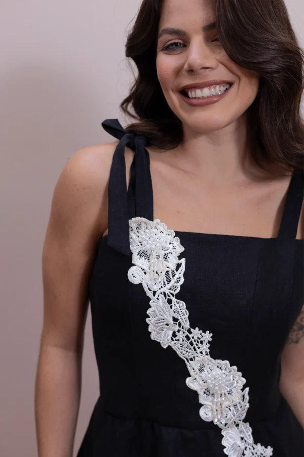 Vestido curto confeccionado em tecido plano encorpado com textura de linho. A peça possui modelagem acinturada com saia de corte evasê em duas camadas sobrepostas, criando um efeito de babados estruturados. O decote é reto, com alças médias de amarrar em laço nos ombros. O diferencial da peça é a aplicação diagonal de uma passamanaria de renda guipure artesanal, que se estende do ombro direito até a barra da saia. A renda é ricamente ornamentada com mini pérolas, cristais e vidrilhos em tom off-white. O fechamento é posterior por zíper invisível.