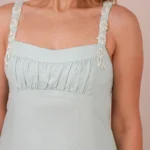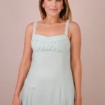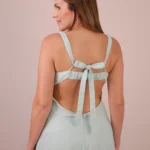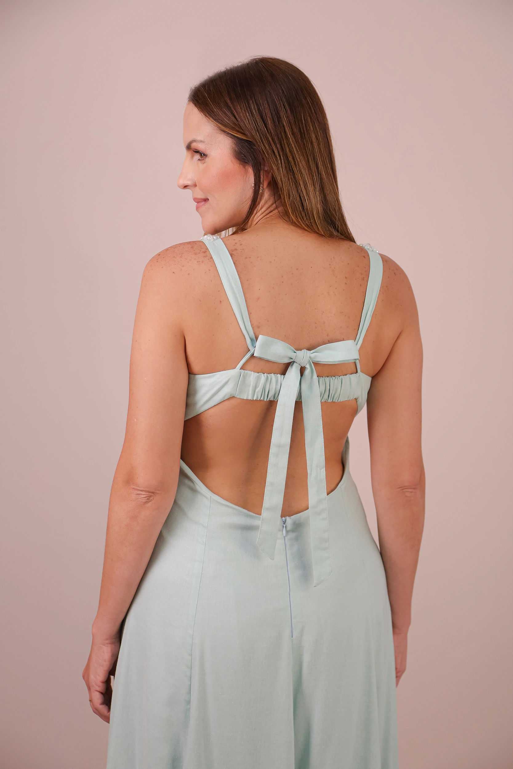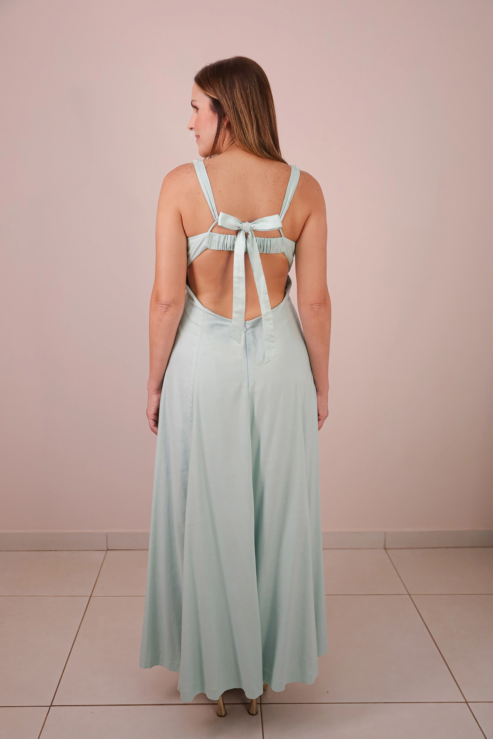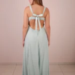 Vestido longo confeccionado em tecido plano estruturado. A peça apresenta decote reto com detalhe de busto drapeado e alças médias inteiramente revestidas por bordados de cristais e pedrarias. A modelagem é acinturada, abrindo-se em uma saia de corte evasê com caimento fluido. As costas possuem decote profundo com acabamento em elástico para ajuste, complementado por amarração em laço com fitas do próprio tecido. O fechamento é posterior por zíper invisível localizado na parte inferior das costas.