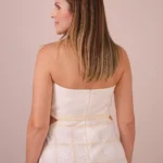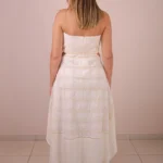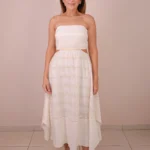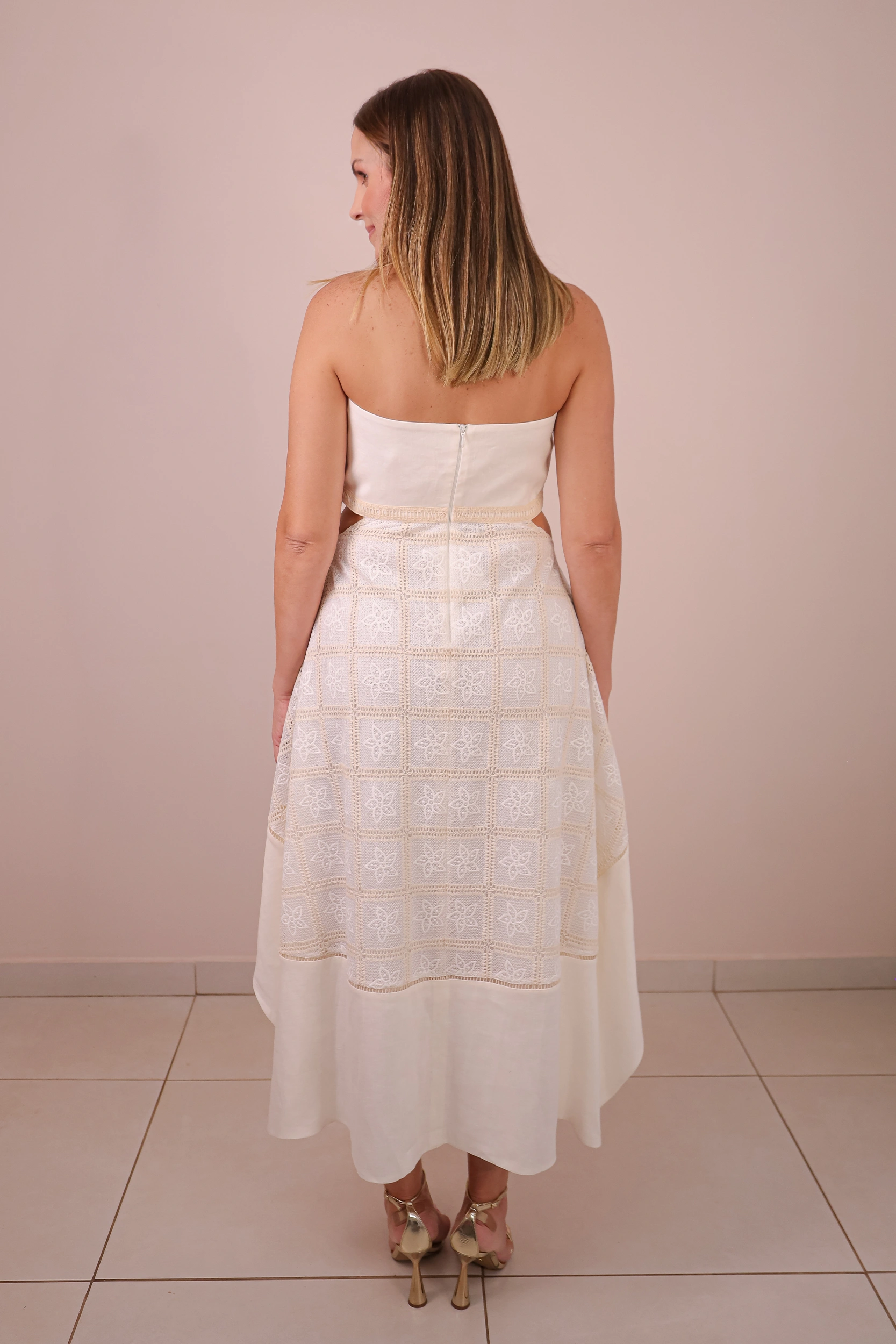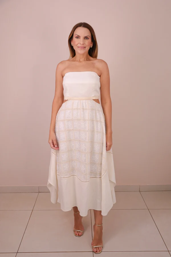 Vestido de comprimento midi confeccionado em tecido plano na cor off-white. A peça possui decote tomara que caia com busto estruturado e liso. Apresenta recortes laterais vazados (estilo cut-out) na altura da cintura, acentuados por um detalhe de passamanaria delicada que contorna toda a circunferência. A saia possui modelagem evasê com painel central em renda ponto palito e bordados vazados de motivos florais geométricos. A barra é finalizada com um barrado liso de corte assimétrico e fluido. O fechamento é posterior por zíper invisível centralizado no busto.