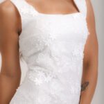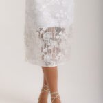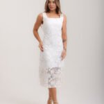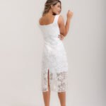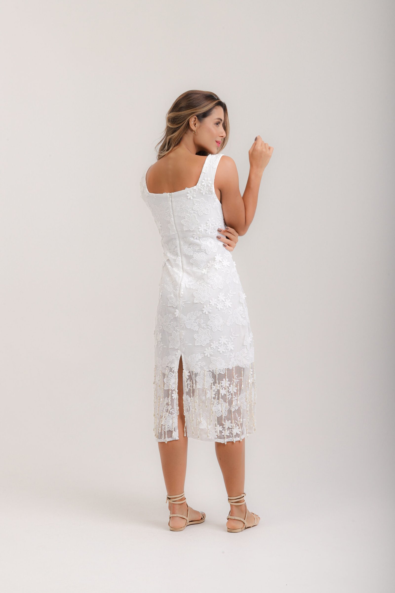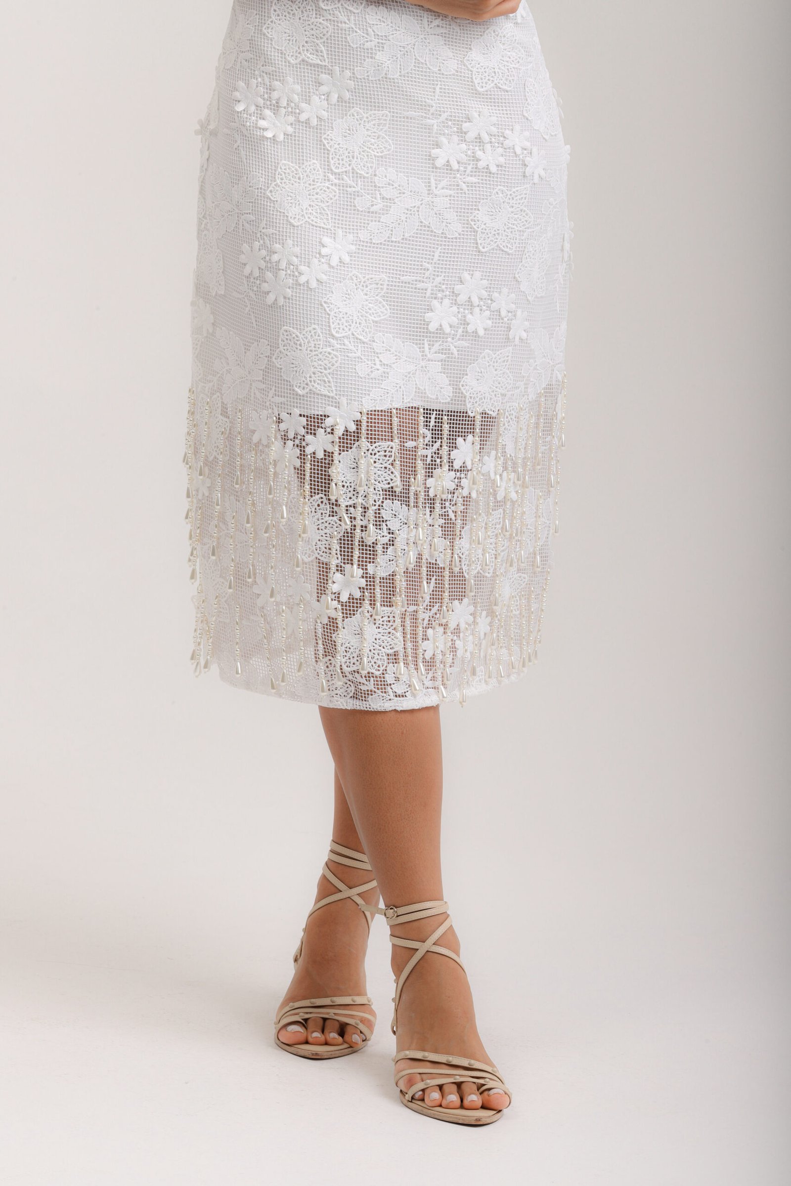Vestido midi, decote quadrado, em renda e franjas de pérola no barrado, forro interno e zíper invisível.