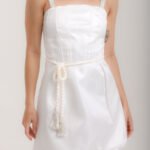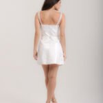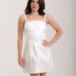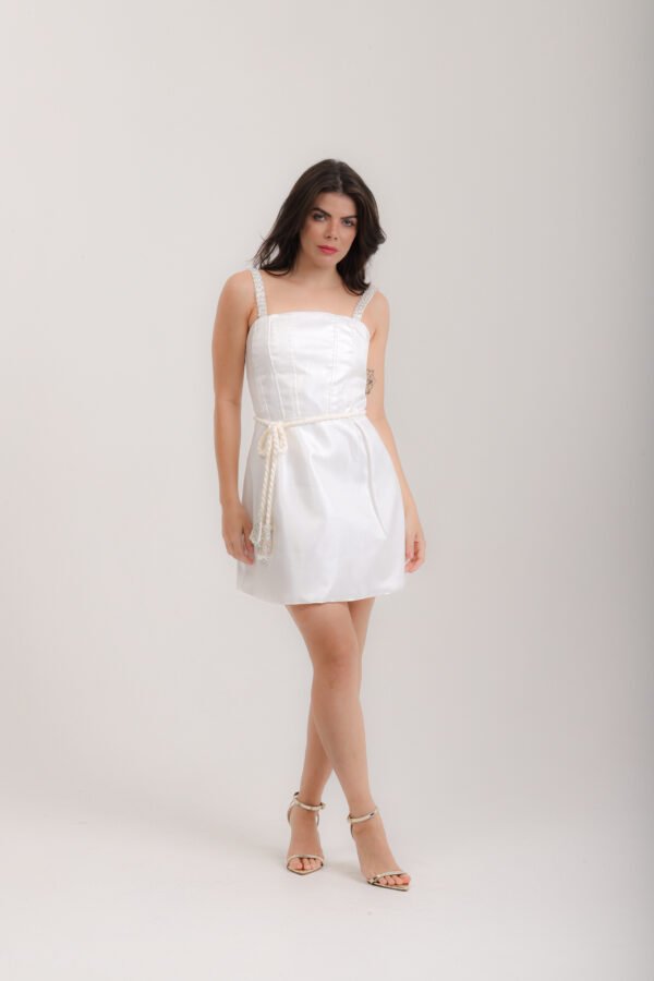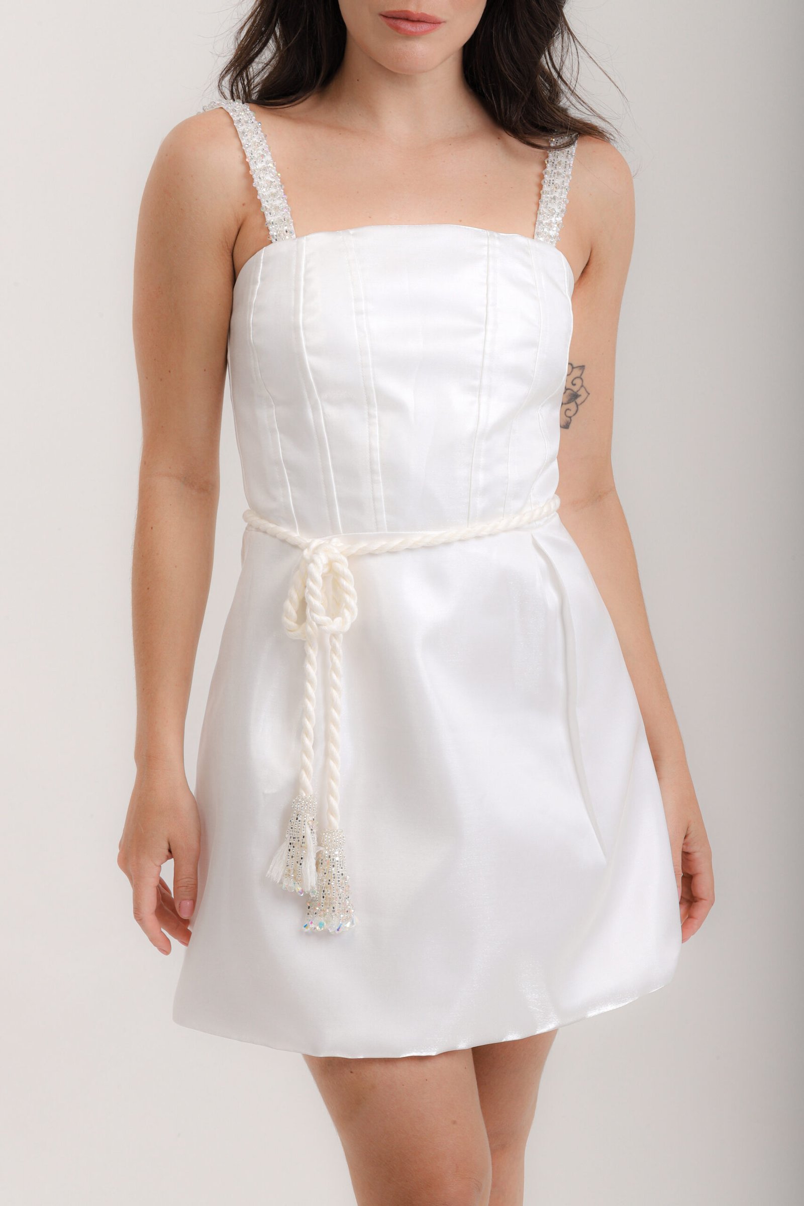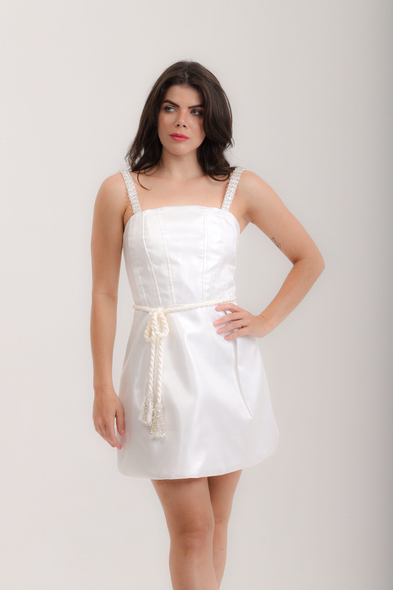 Vestido curto em zibeline glow off white, corpo estruturado com barbatanas, com alças e cinto corda bordados em vidrilhos, miçangas, pérolas e cristais, forro interno e zíper invisível.